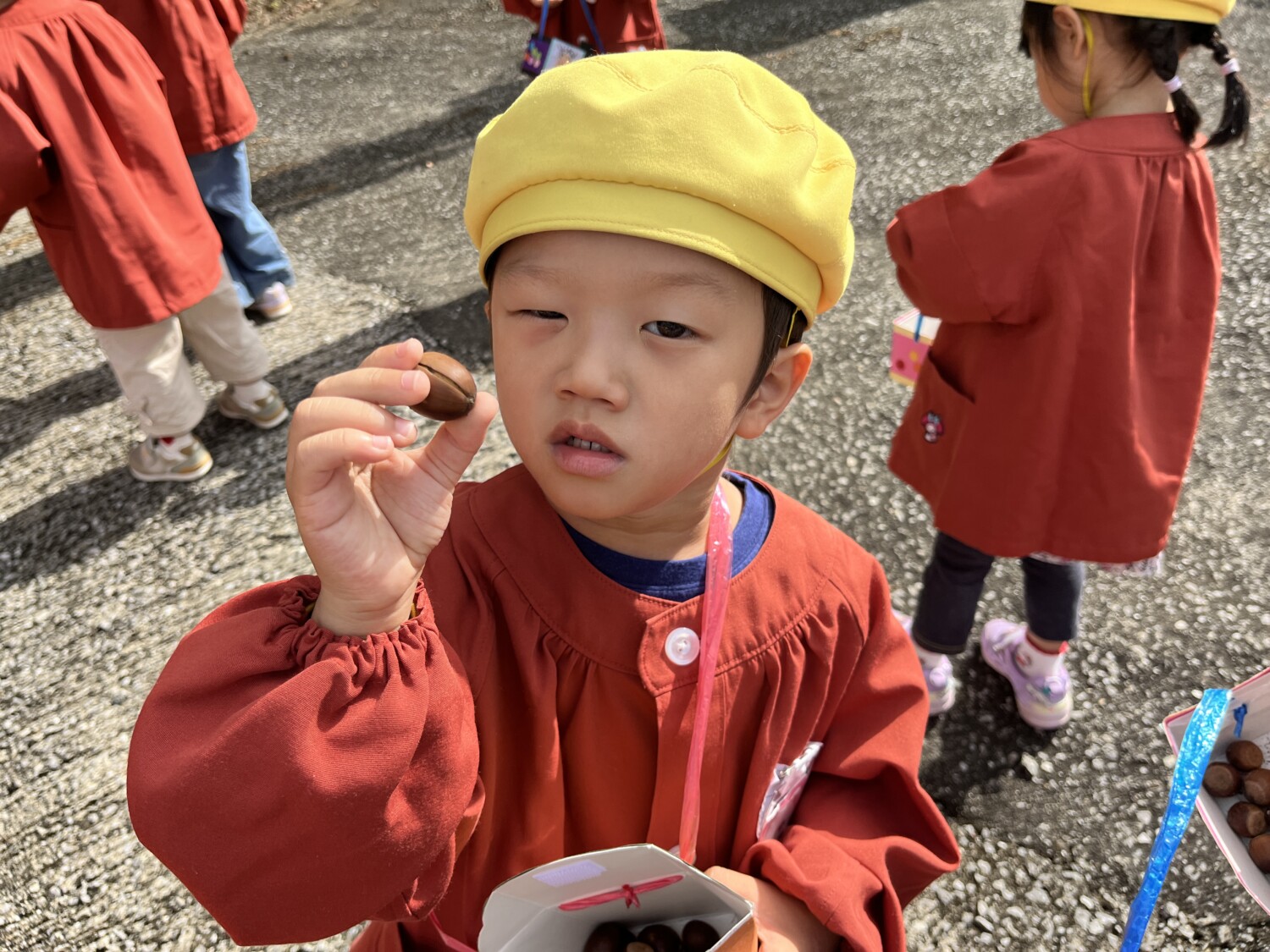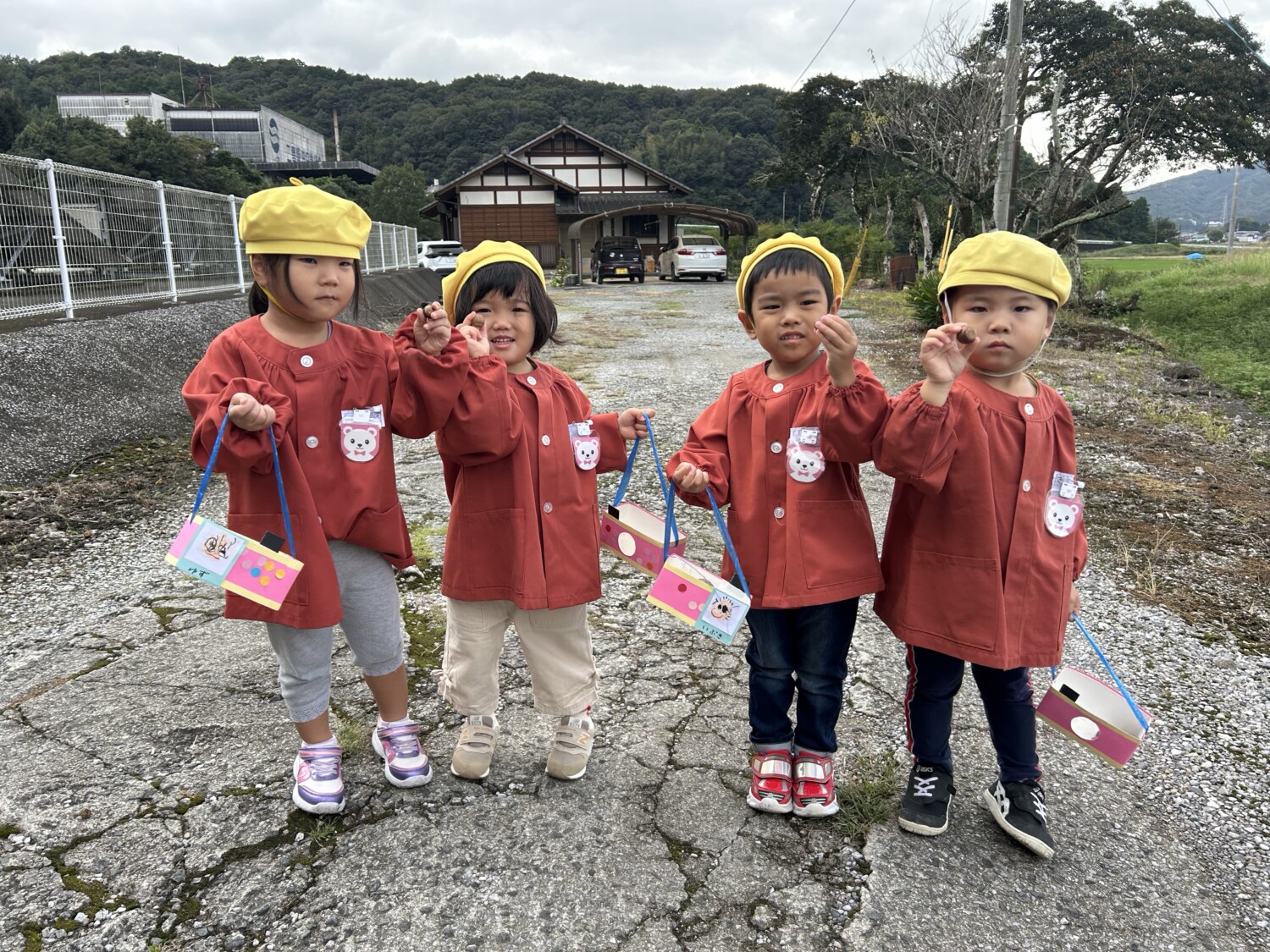 おにぎりと、自分で作ったどんぐりの箱を持って出発🎒