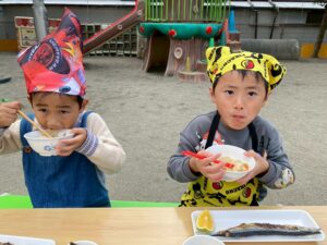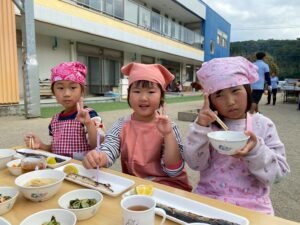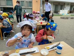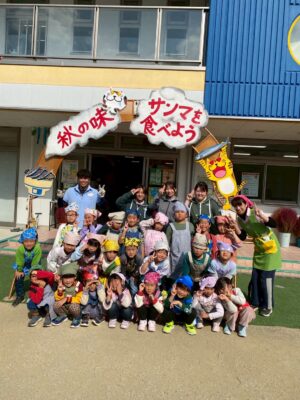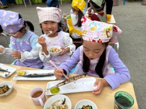 さんまも焼き上がり、だんご汁も出来上がって、みんなで命に感謝していただきます☺️✨