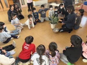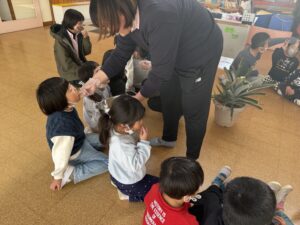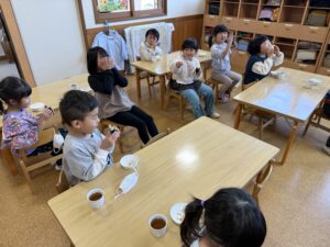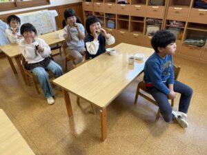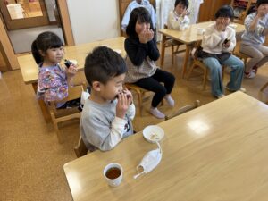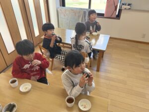 その後おやつでは可愛い恵方巻きをみんなでちゃんと南南東を向いて願い事をしながら喋らずに食べました😆✨真剣に頬張る姿が可愛らしかったです☺️