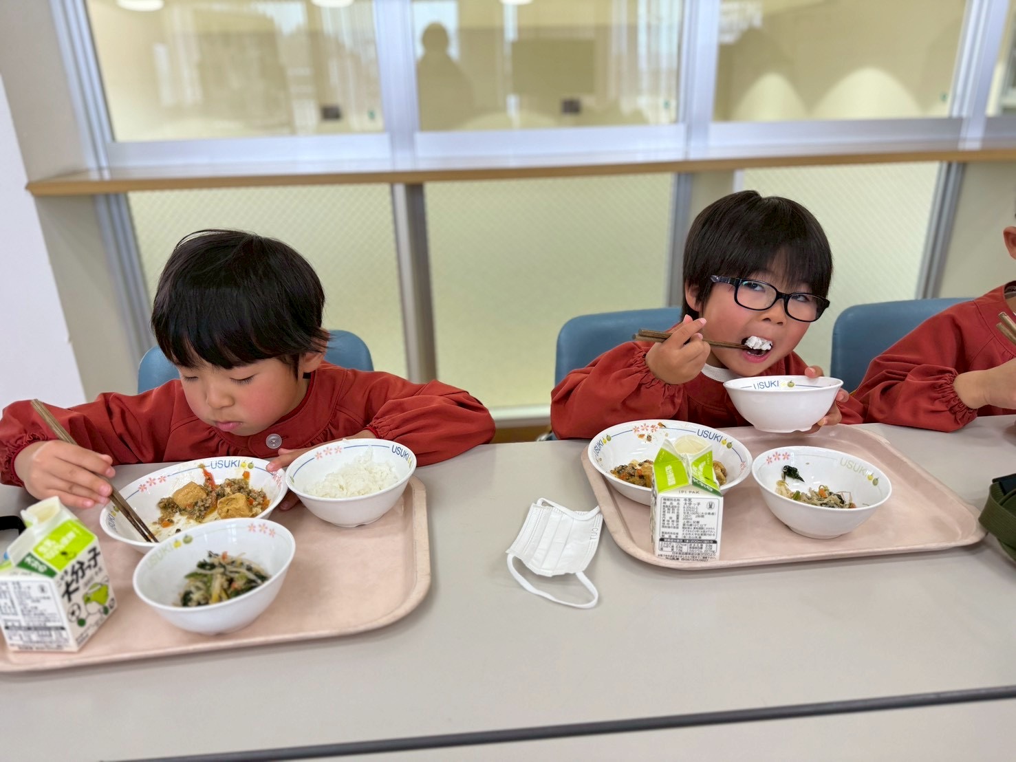配膳された給食をみて「美味しそう!!」「お皿が大きい?!」などの声が沢山聞こえてきました😂みんなで「いただきます」をして食べました✨
