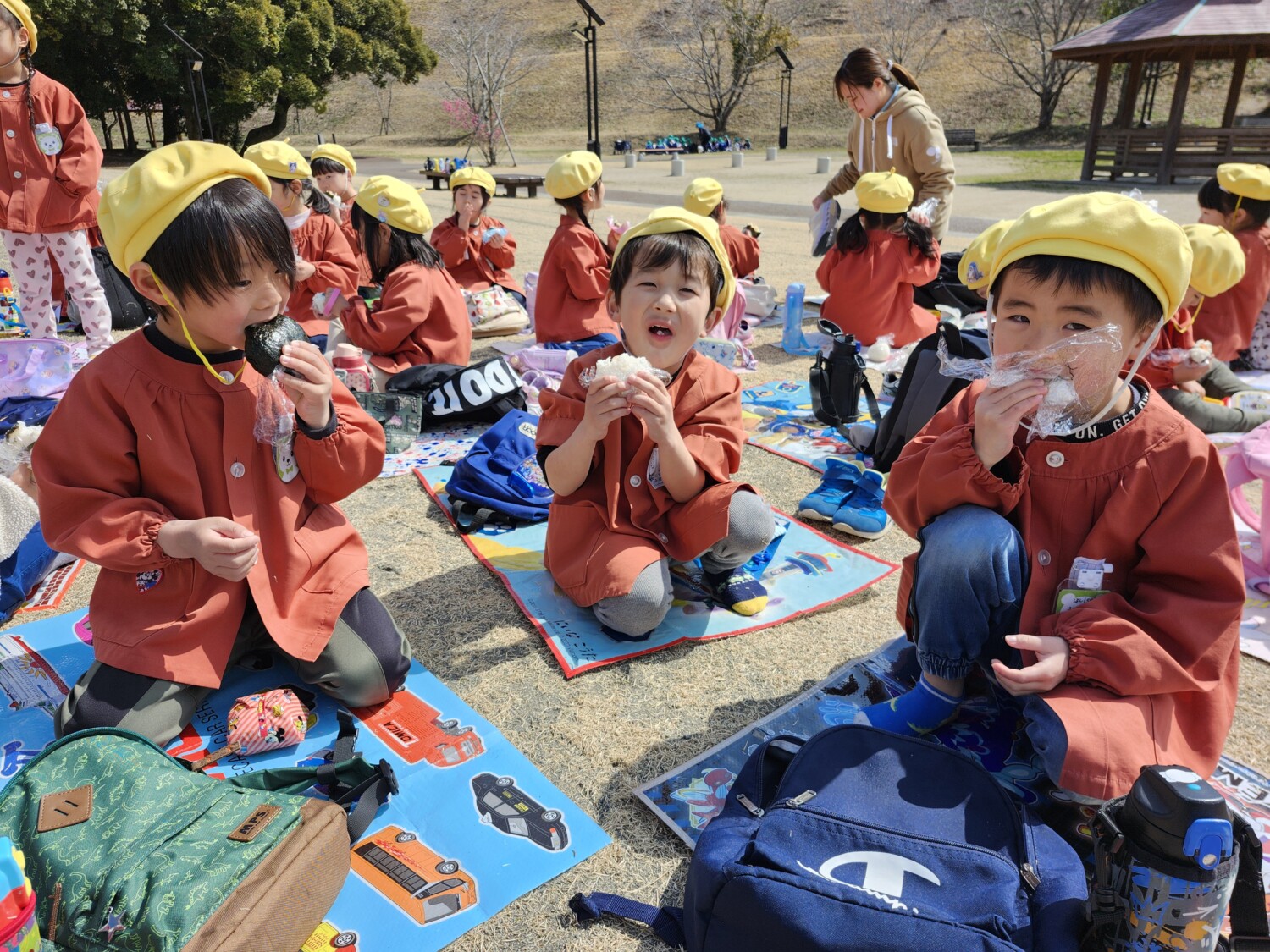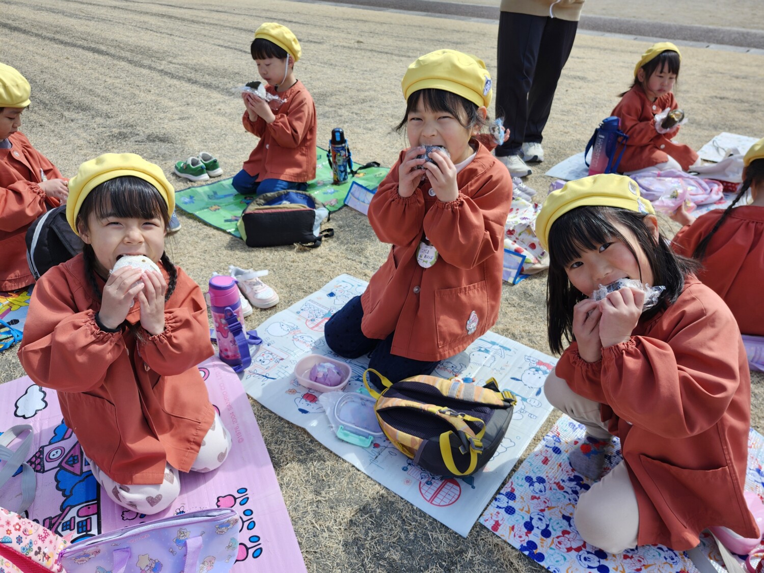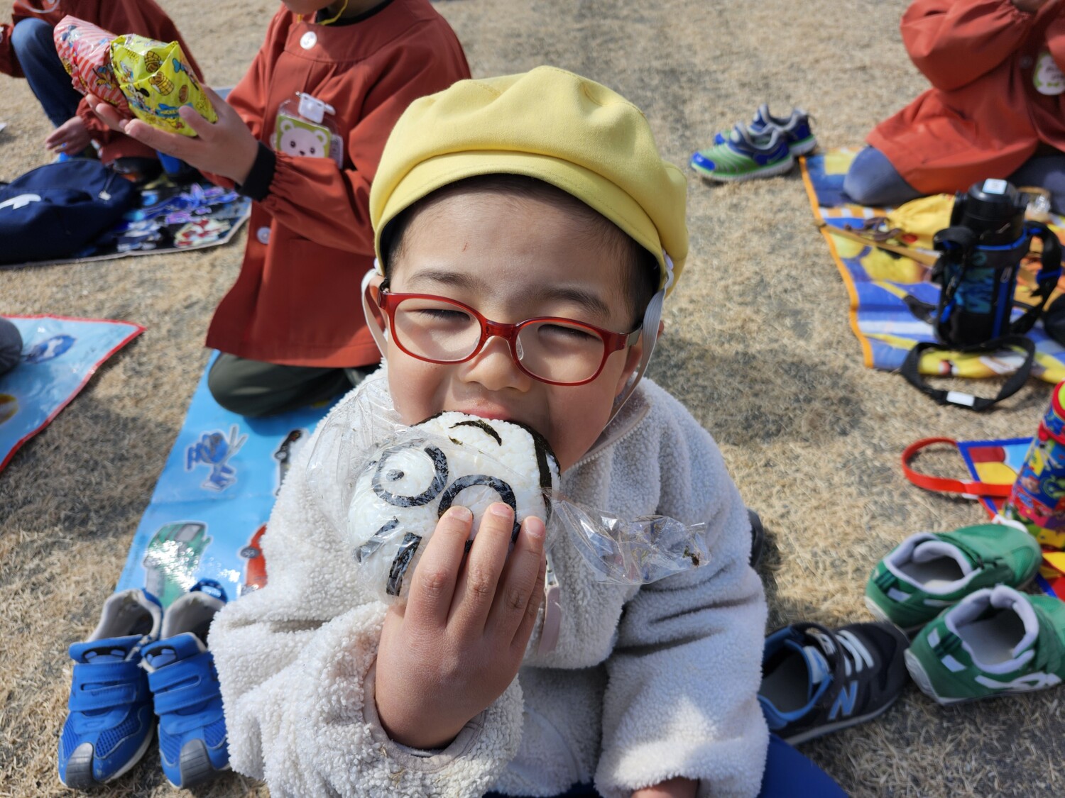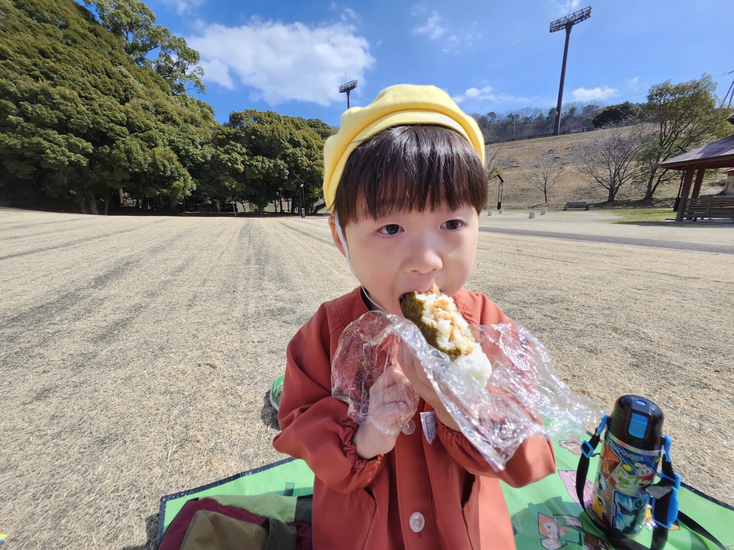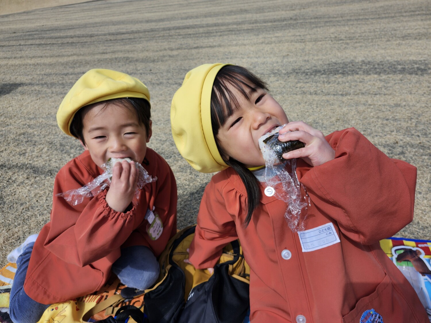 いっぱい遊んだらお腹もペコペコ‼お家の方が作ってくれた”ばくだんおにぎり🍙”をみんなで食べたよ✨