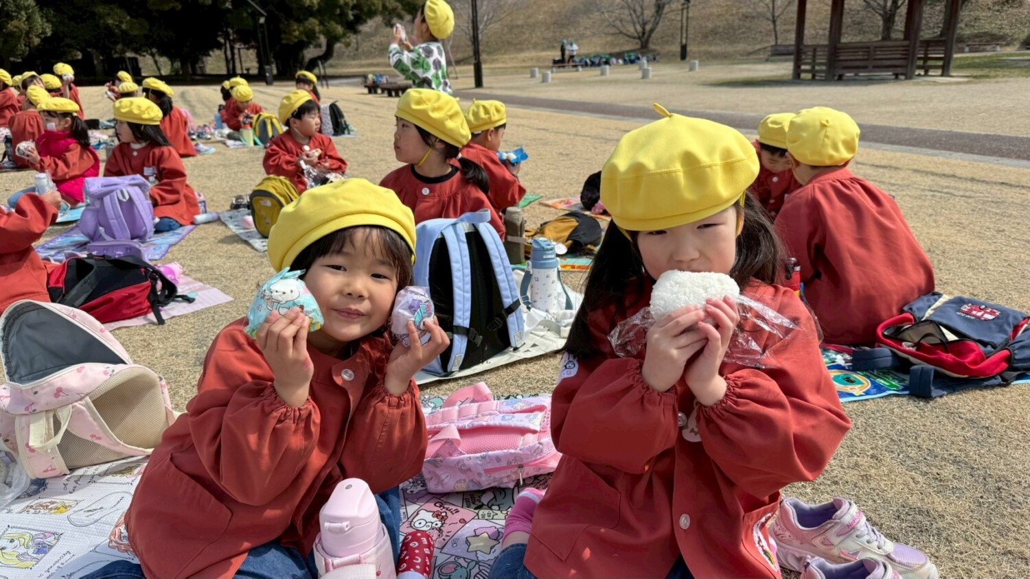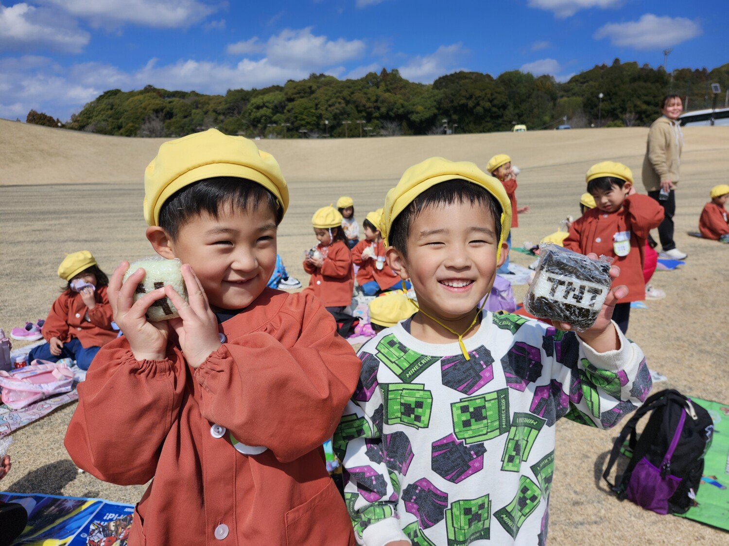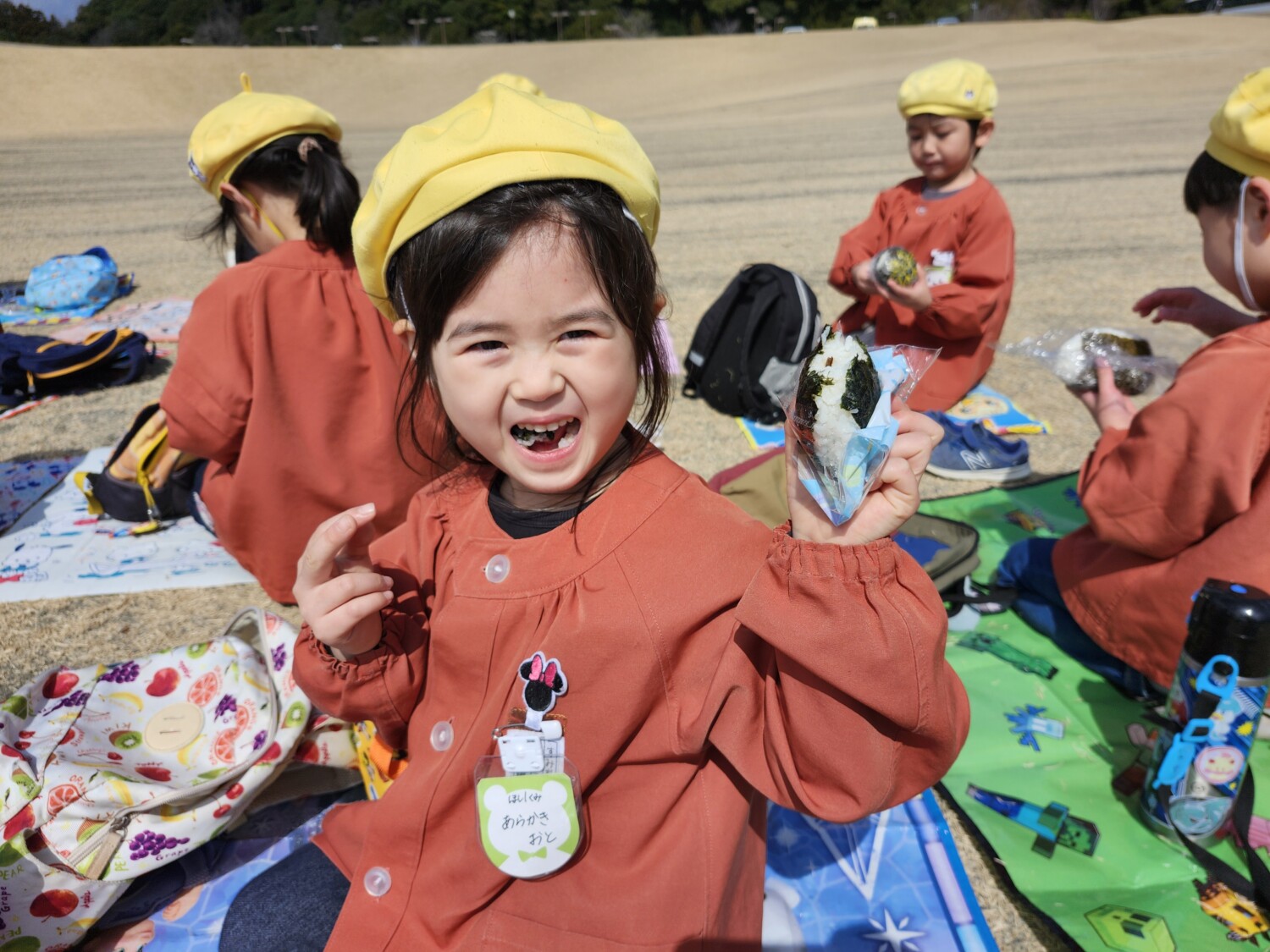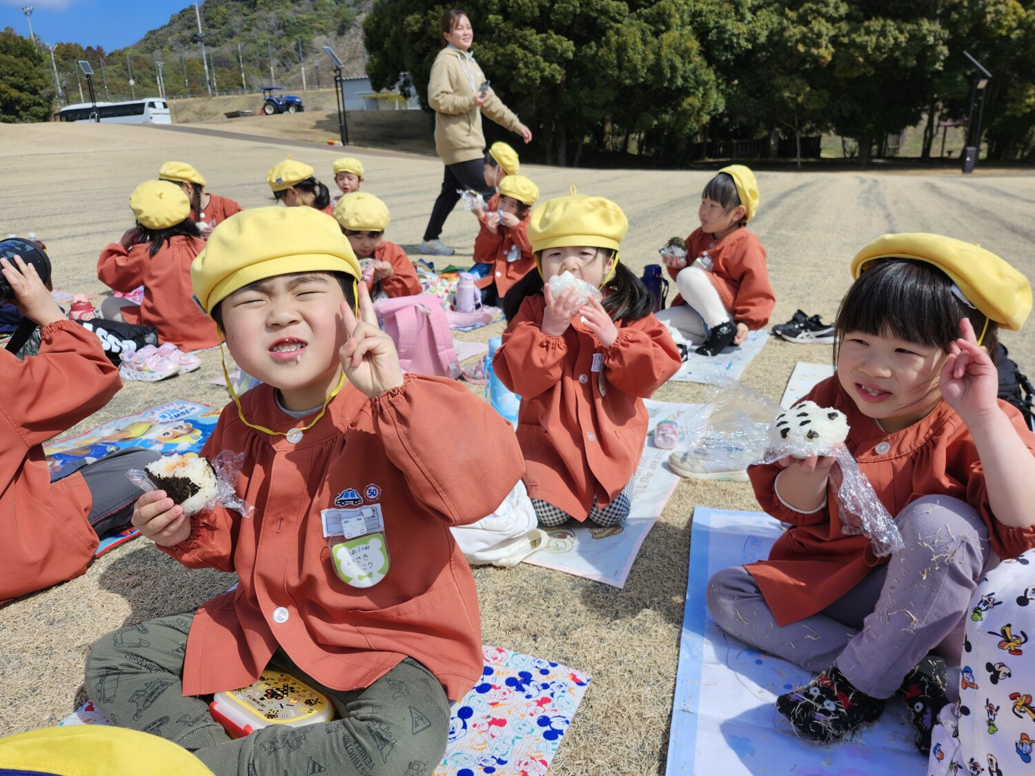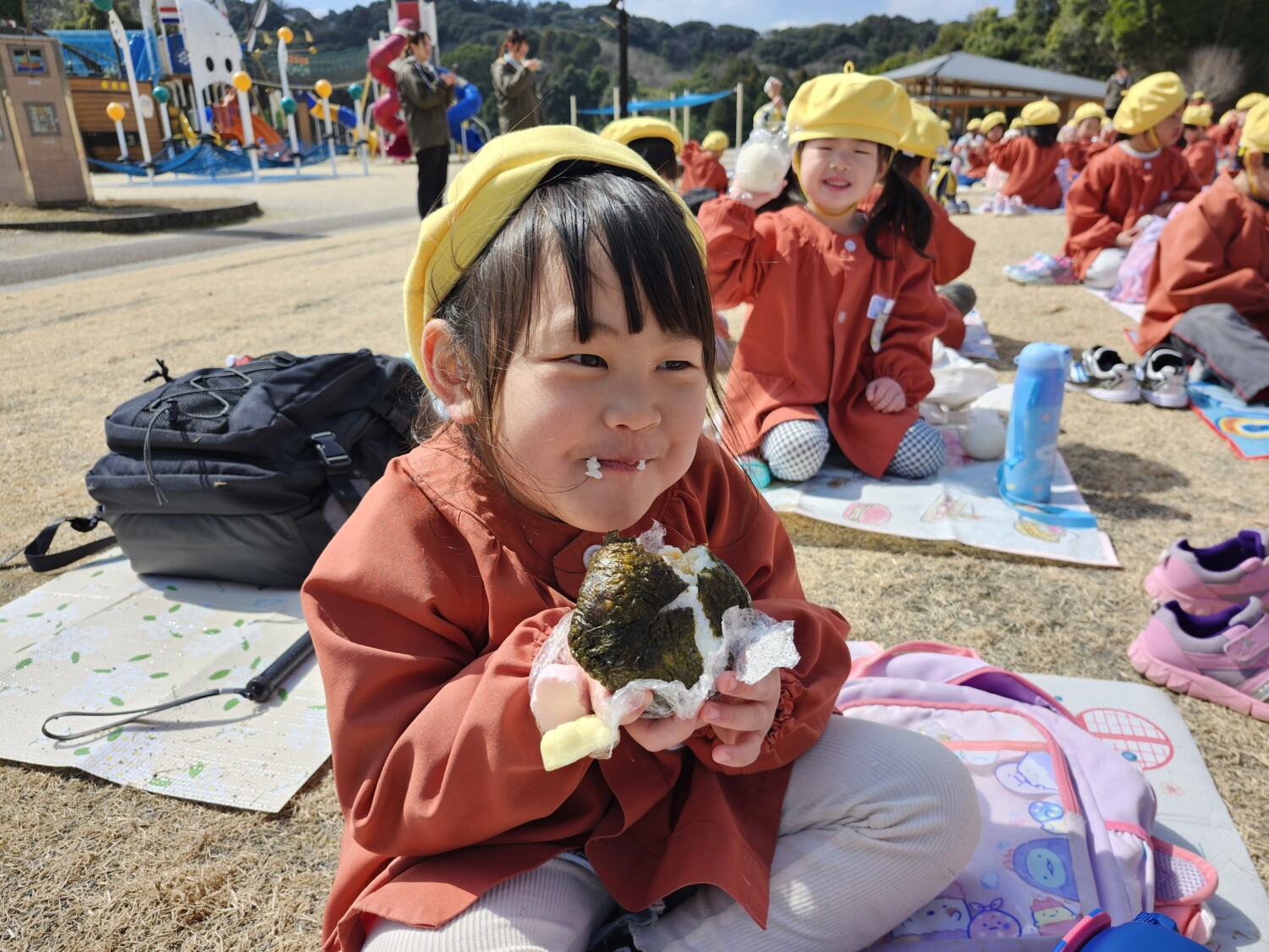 いっぱい遊んだらお腹もペコペコ‼お家の方が作ってくれた”ばくだんおにぎり🍙”をみんなで食べたよ✨