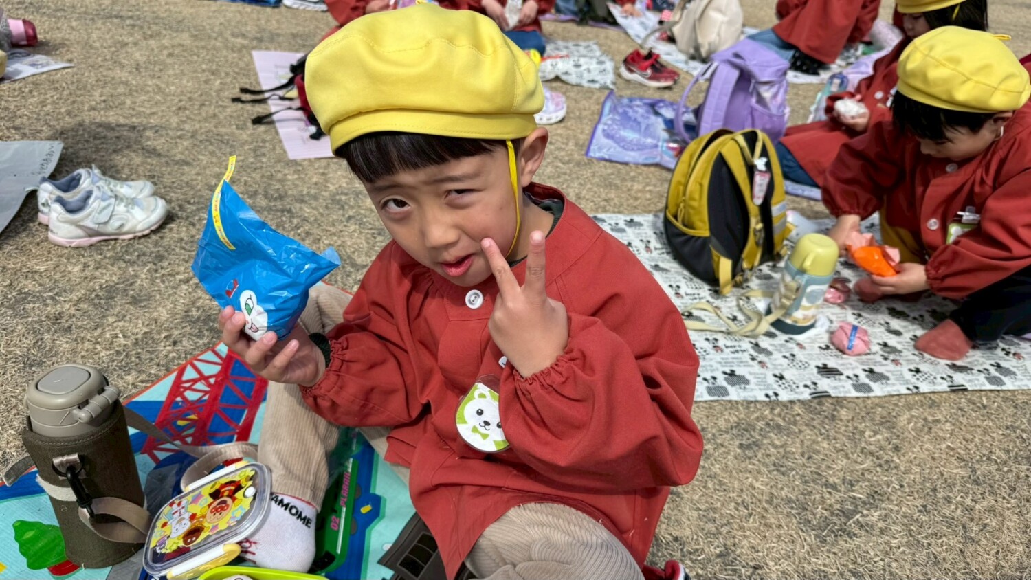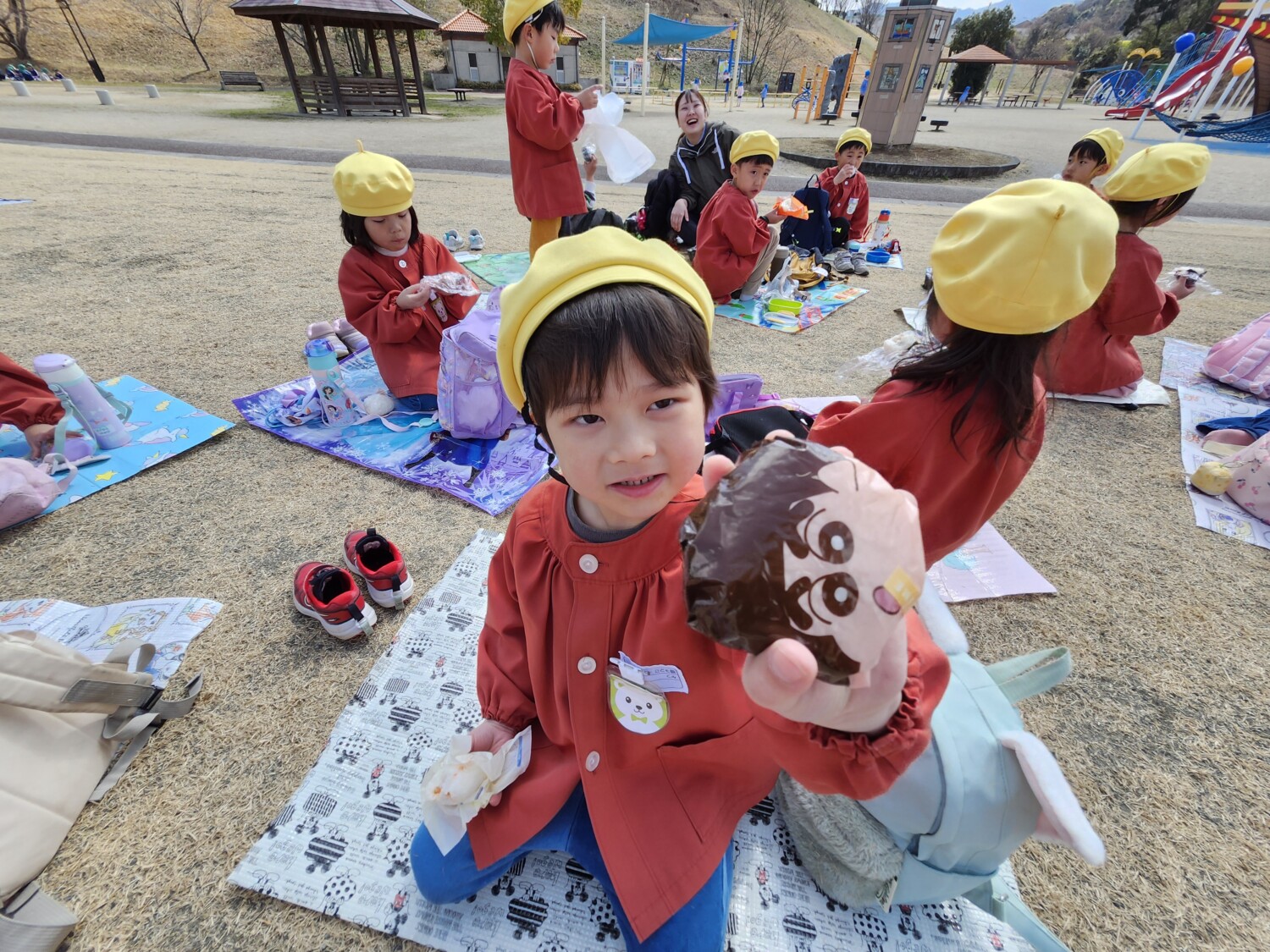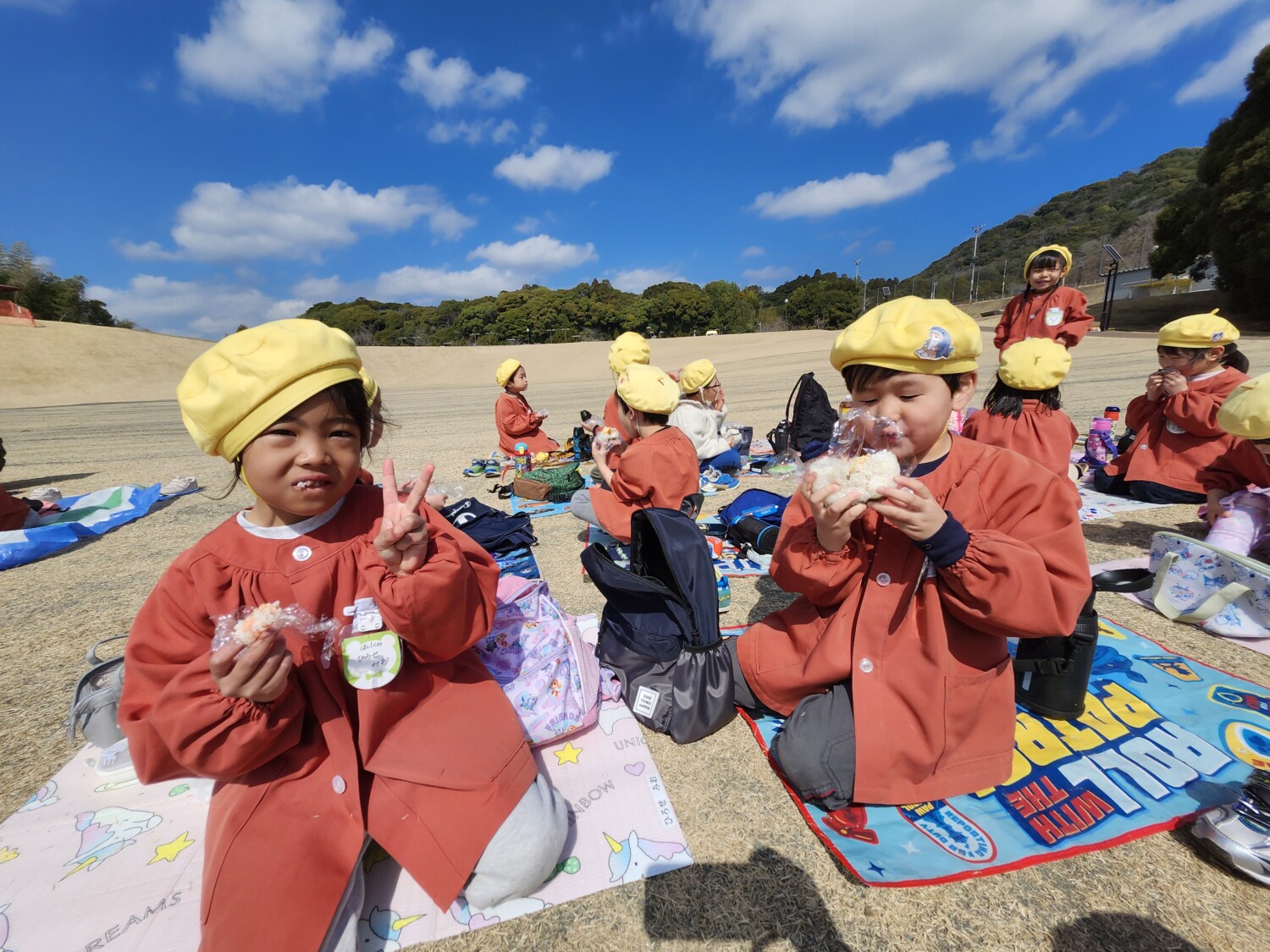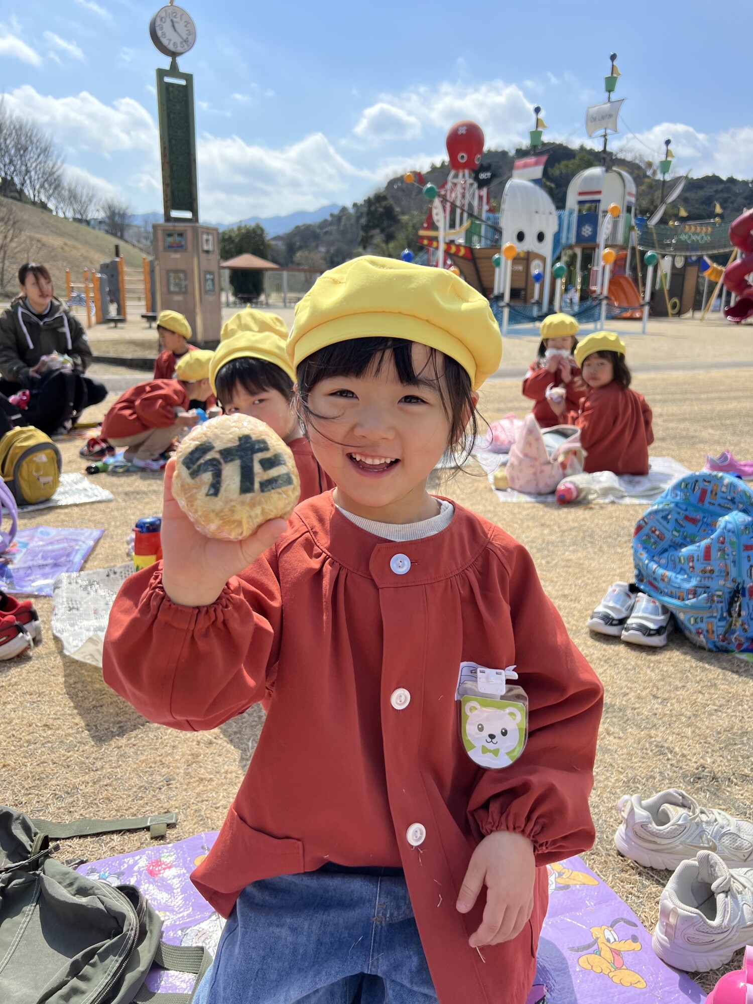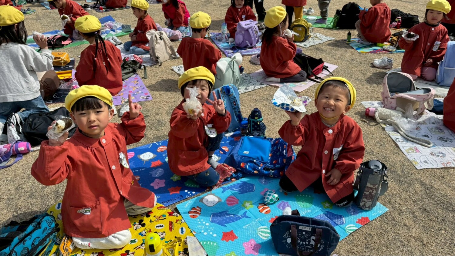 いっぱい遊んだらお腹もペコペコ‼お家の方が作ってくれた”ばくだんおにぎり🍙”をみんなで食べたよ✨