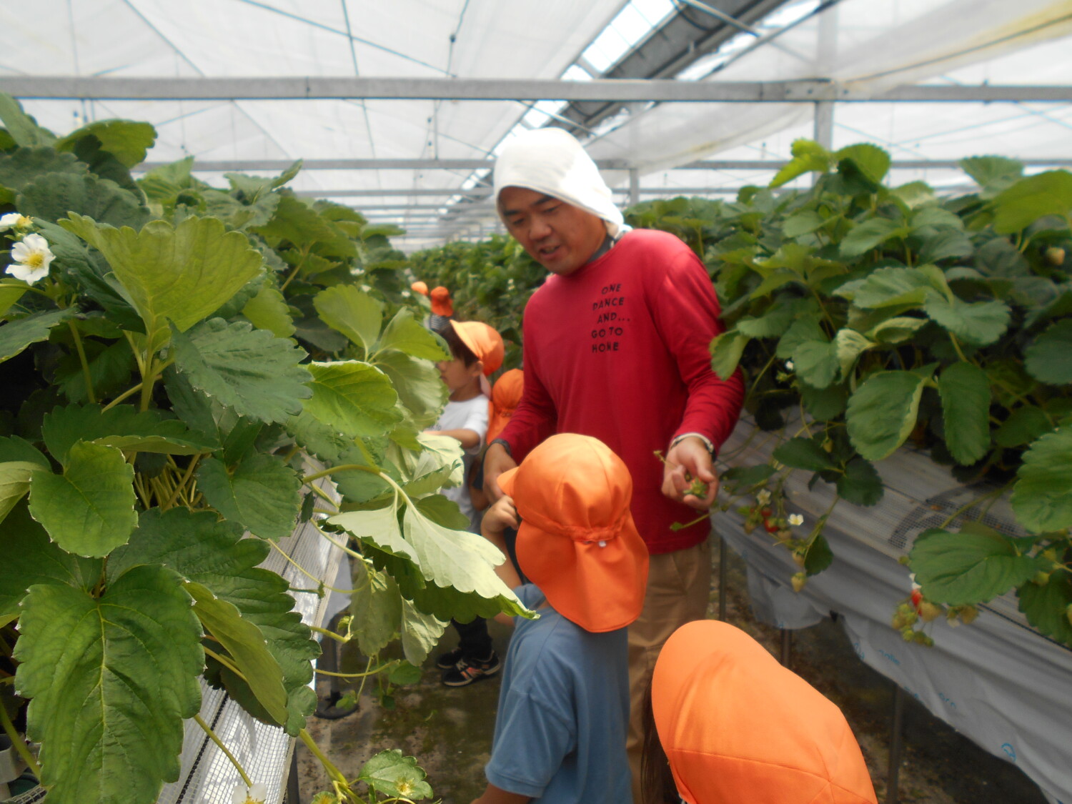 ほし組の藤田空くんのお父さん・お母さんが『美味しいいちご・採ってはいけないいちごの見分け方』『いちごの採り方』を教えてくれました。このハウスの中には、”さがほのか”や”ベリーツ”という名前のいちごがありました🍓