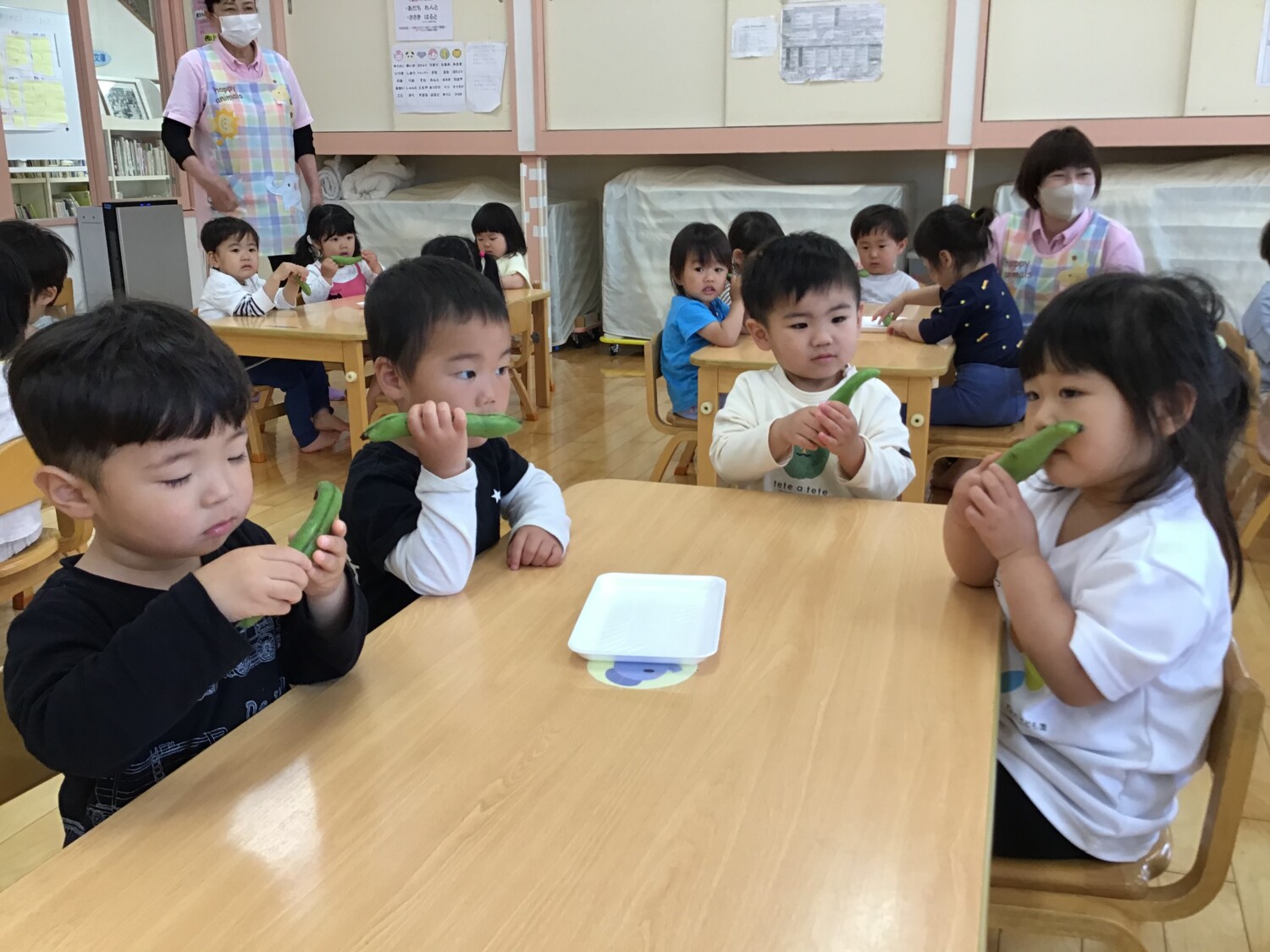 「そらまめは空に向かってなるんだよ!でもね・・・食べられる頃には下を向いてるよ!」とお話をした後に『そらまめくんのベッド』の絵本の読み聞かせをしました📖